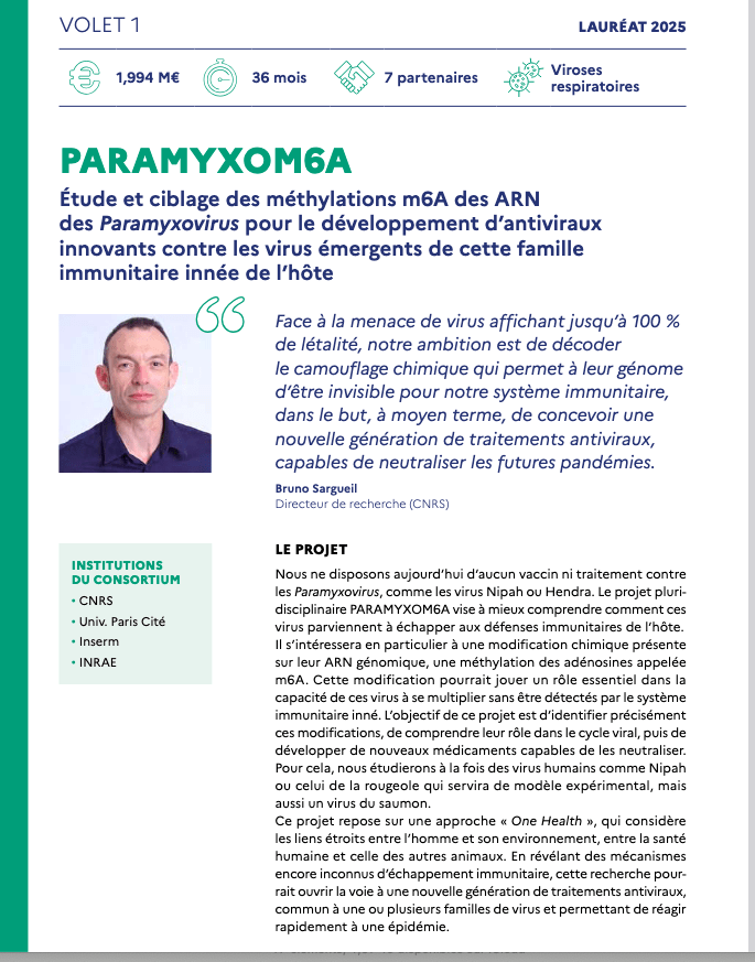 Le projet Paramyxom6A, porté par le Dr. Bruno Sargueil, est lauréat de l’appel à projet PEPR ANRS MIE 2025. Ce projet, qui implique 7 partenaires dont 3 équipes de l’ICB, porte sur l’étude et le ciblage des méthylations m6A des ARN des Paramyxovirus.